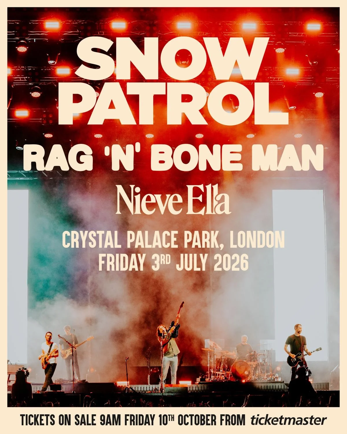 Northern Irish alt-rock powerhouses Snow Patrol have announced a massive open-air concert at London’s Crystal Palace Park on Friday, 3 July 2026. Joining them on stage will be the soulful Rag ‘N’ Bone Man and rising indie-pop star Nieve Ella.