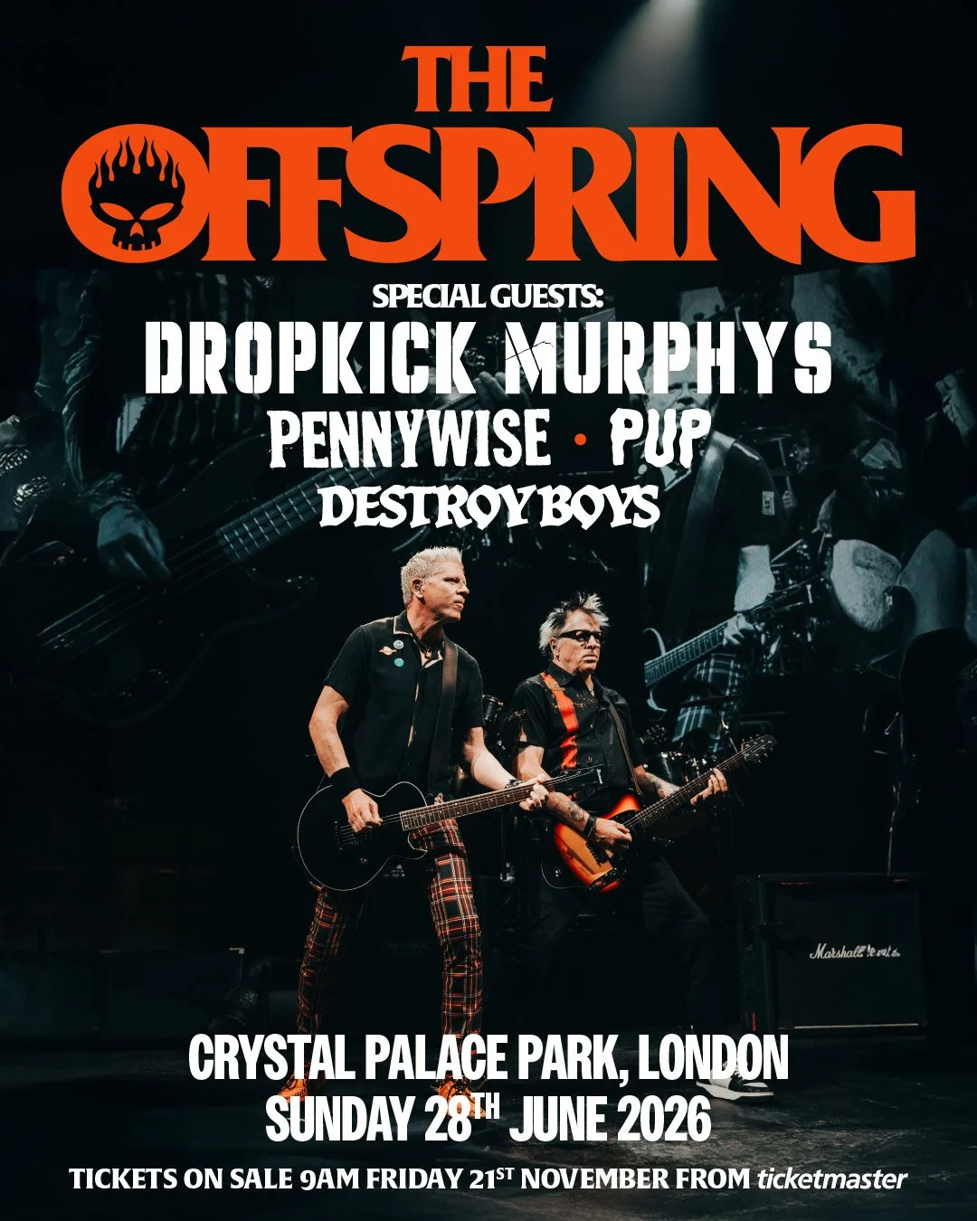 Punk-rock powerhouses The Offspring have announced a massive outdoor show at London’s Crystal Palace Park on Sunday 28 June 2026. They’ll be joined by a stacked lineup of special guests: Dropkick Murphys, Pennywise, PUP, and Destroy Boys.
